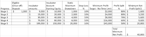 Each trading account is supported by a one-time deposit and you never need to add any more risk capital as you progress up the stages